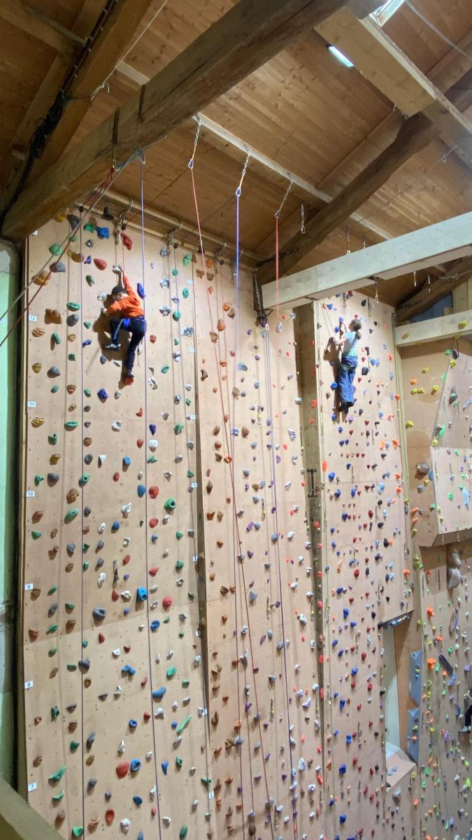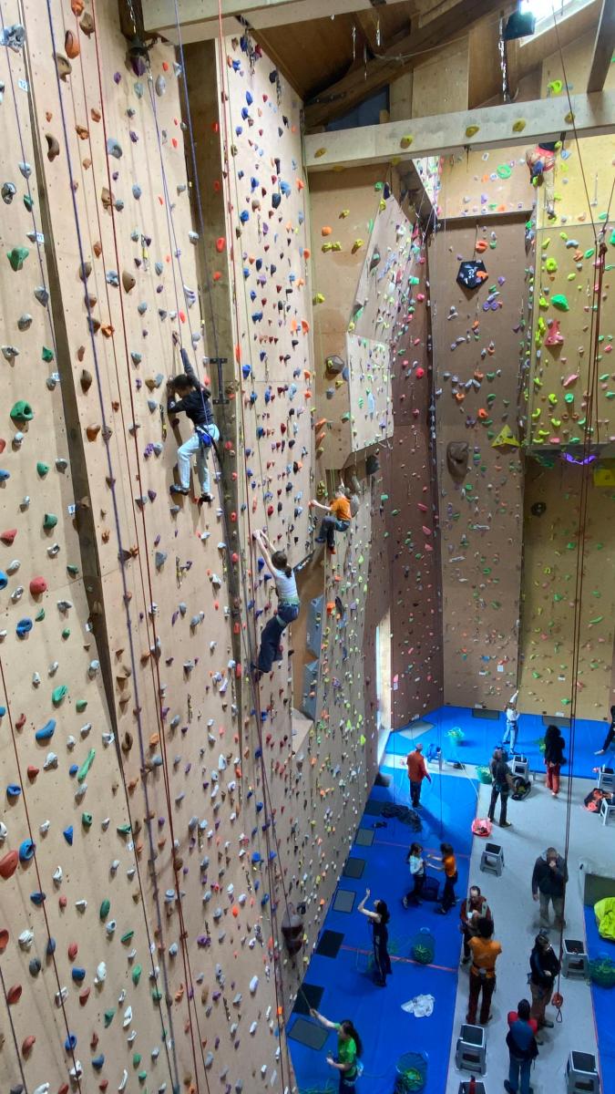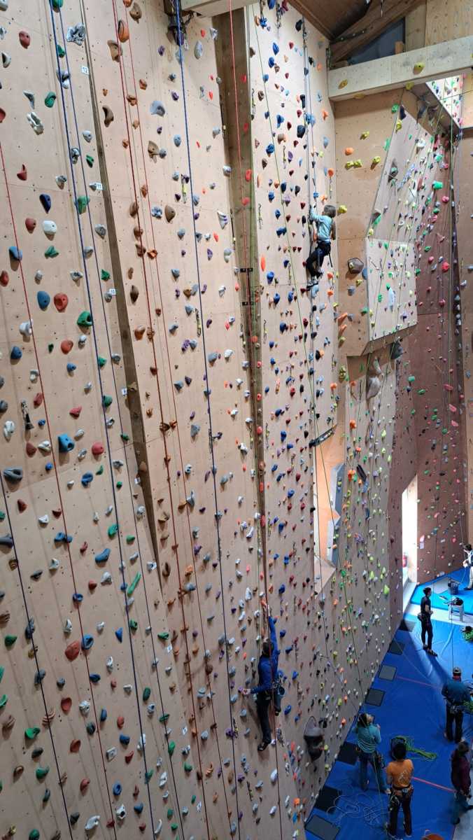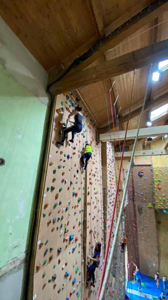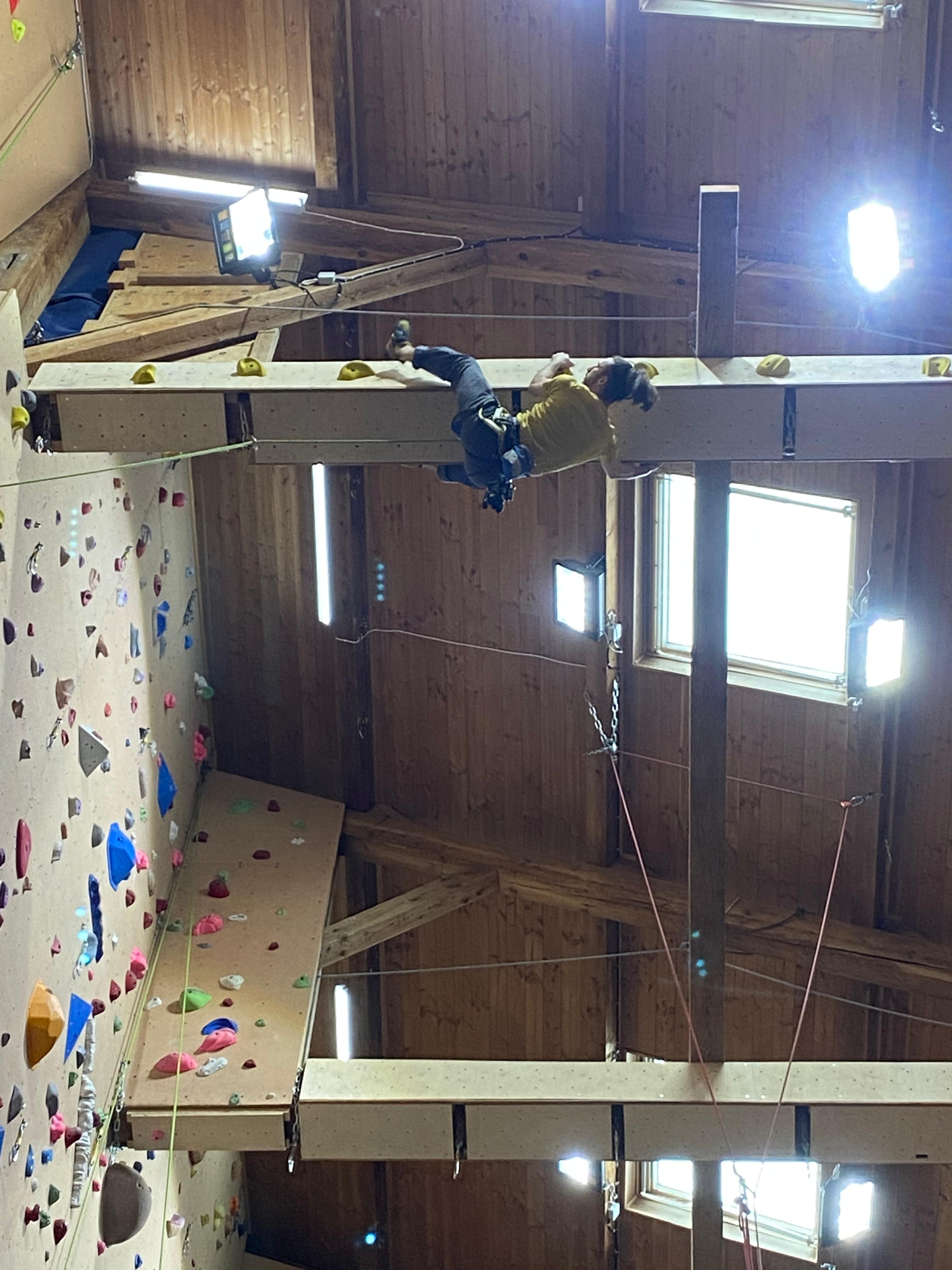 Tout commence, par un petit déjeuner et explication du défi de la journée, cumuler le plus de voies possibles et atteindre des sommets. Puis l’envie plus forte que tout, rapidement, les premières voies s’enchainent. Tout le monde s’en donne à cœur joie. De la voie, du bloc, sans oublier la traversée de poutre à plus de 10m du sol !